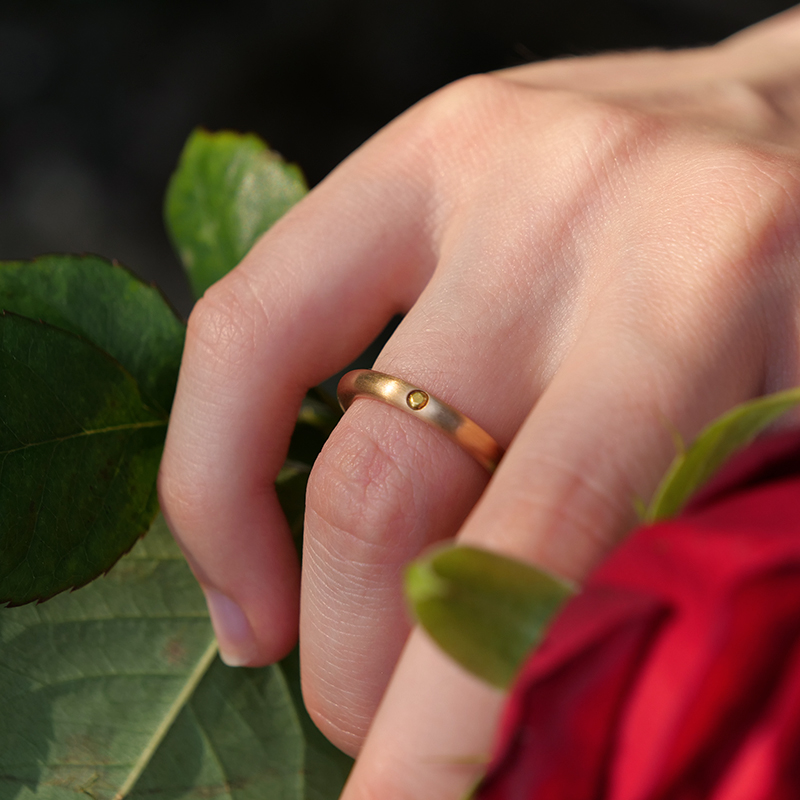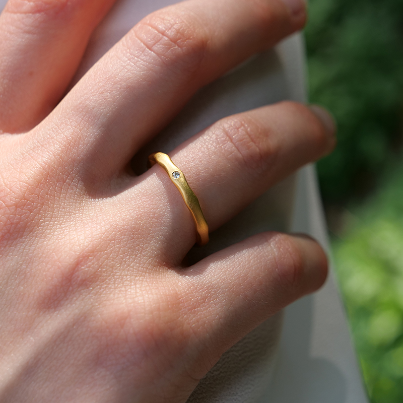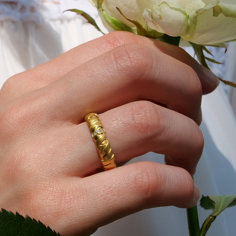 Ein zarter Ring aus edlem Gold, fein mattiert, mit dezentem Schwung – gekrönt von einem winzigen Diamanten, der zeitlose Eleganz still zum Ausdruck bringt.