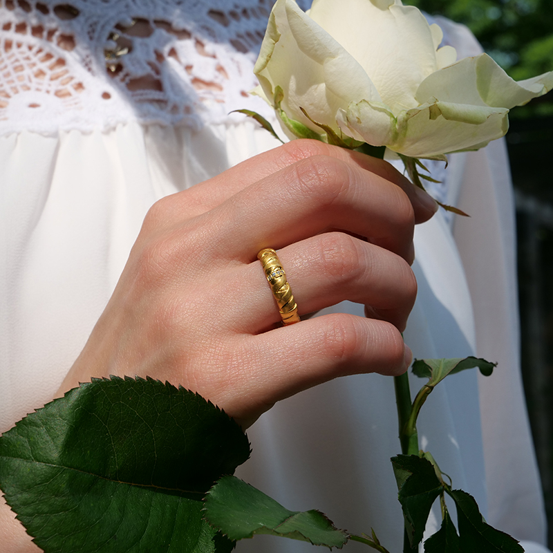 Der Höhepunkt der Liebe, die Hochzeit des Lebens, findet seine formgebende Entsprechung. Die bisher beiläufigen Seitenflächen werden zur Oberfläche und vereinen sich in einer kaum wahrnehmbaren Linie. Ganz schlicht oder betont mit einem oder mehreren Brillanten in Reihe.